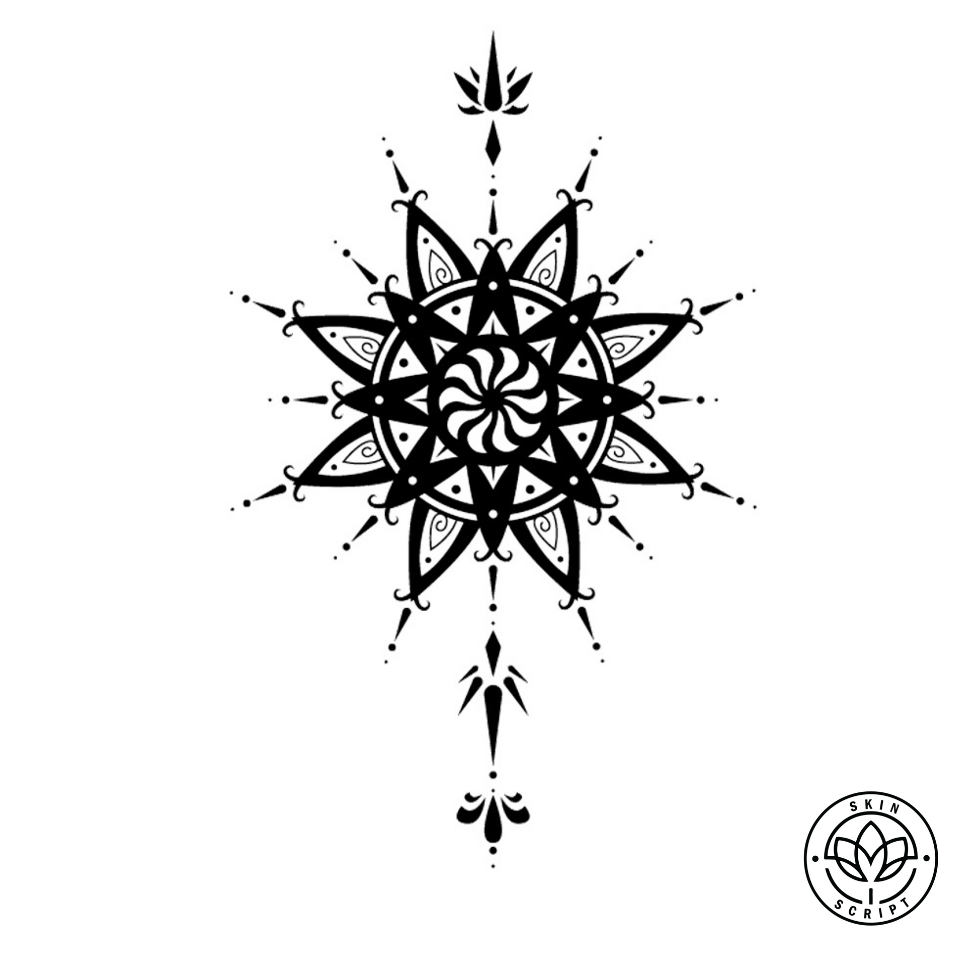 This radiant starburst mandala tattoo symbolizes balance, energy, and connection to the cosmos. Its symmetrical beauty and intricate design make it a perfect choice for placements like the forearm, chest, or back.
