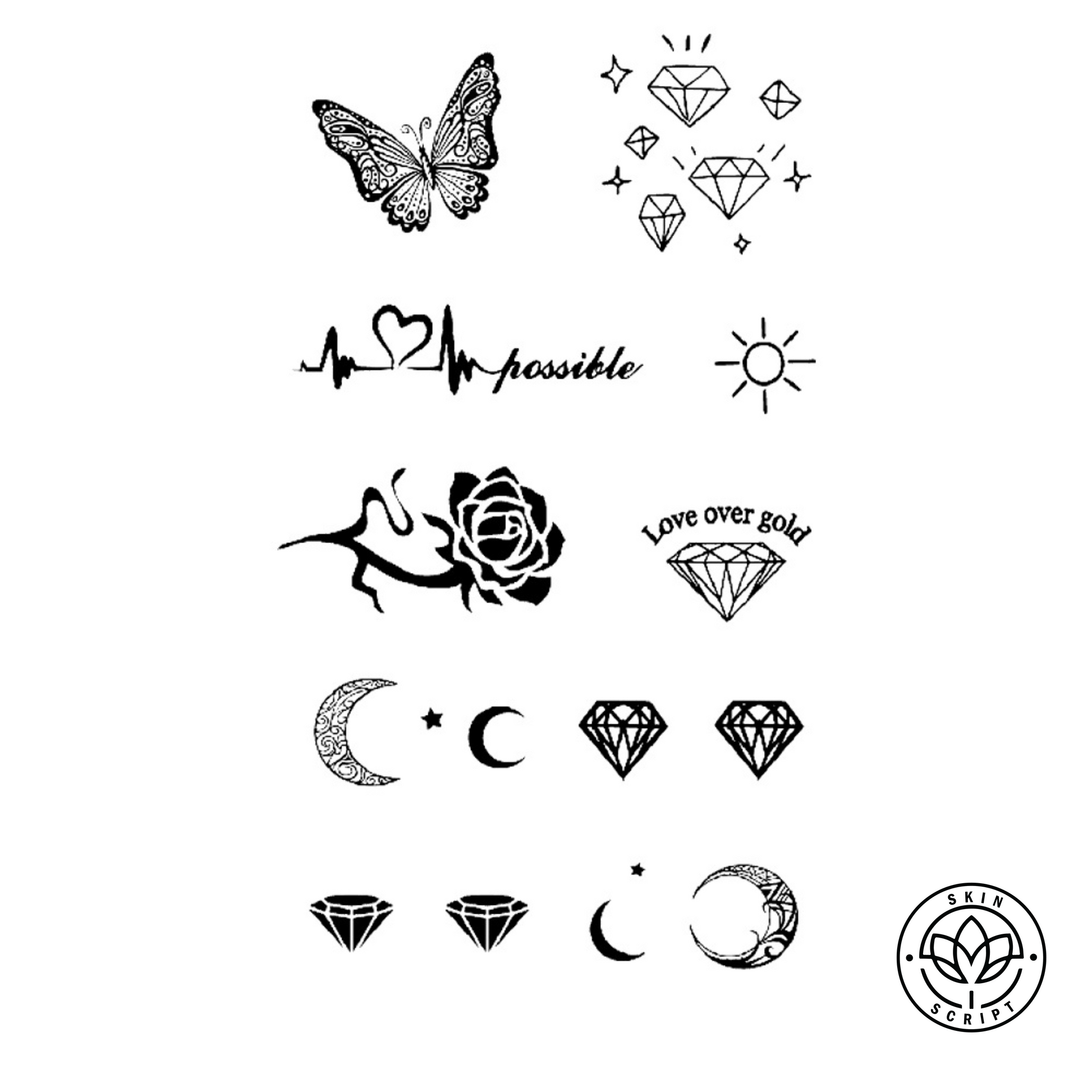 A versatile collection of minimalist tattoo designs, ranging from delicate butterflies and roses to celestial moons and sparkling diamonds. These designs embody elegance, love, and timeless charm, perfect for creating a personal and meaningful statement.
